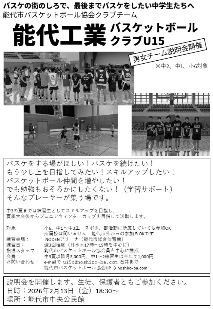 能代工業バスケットボールクラブU15へご興味をいただきありがとうございます。
